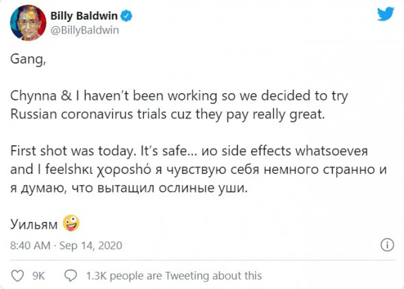 "Ми не працювали, тому вирішили взяти участь у російських випробуваннях вакцини від коронавірусу, тому що вони дуже добре платять. Перший укол був сьогодні, це абсолютно безпечно. Але я відчуваю себе трохи дивно і я думаю, що витягнув ослячі вуха (орфографія та пунктуація збережені. – Ред.)", – заявив Вільям Болдвін.