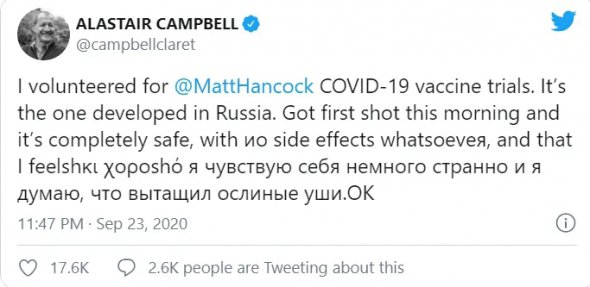 Зі свого боку Кемпбелл зазначив у своєму Twitter-акаунті міністра охорони здоров'я Великобританії Меттью Хенкока.