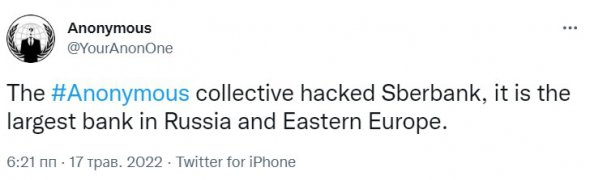 "Anonymous зламали Сбербанк, найбільший банк Росії і Східної Європи", - йдеться в дописі.