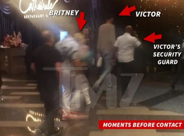 Вона підійшла до нього ззаду і поклала руку на плече. Охоронець баскетболіста не впізнав поп-зірку. Він відштовхнув артистку тильним боком руки і потрапив по обличчю. Внаслідок удару артистка нібито впала на землю і з неї злетіли окуляри.