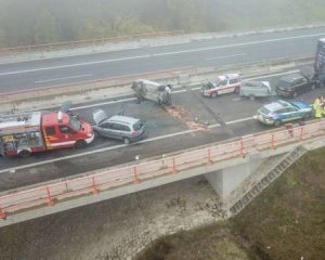 Аварія сталася на національній трасі А7. Водій пікапа втратив контроль над керуванням своїм автомобілем на мосту через річку Майн та врізався у відбійник між смугами. Через ожеледицю та погану видимість – менше 50 м - наступні авто не змогли вчасно загальмувати.