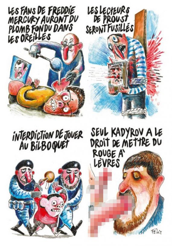 Французький сатиричний журнал Charlie Hebdo створив низку карикатур до матеріалу "Полювання на геїв у Чечні".