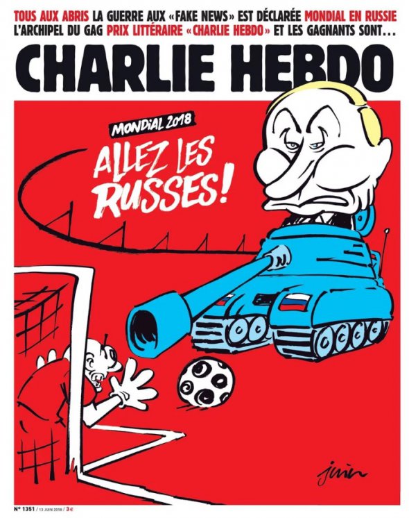 Французький сатиричний журнал Charlie Hebdo присвятив номер за 13 червня початку Кубку світу з футболу у Росії. На обкладинці розмістили карикатуру російського президента Володимира Путіна.