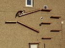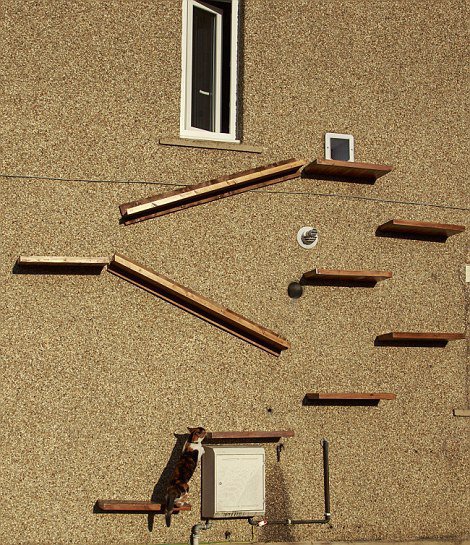 47-летний Марсін Телус із Едінбурга зробив отвір для котячих дверей у стіні свого будинку, для кішки Сімби. Котячі сходи зроблені із полиць і дерев'яних блоків.