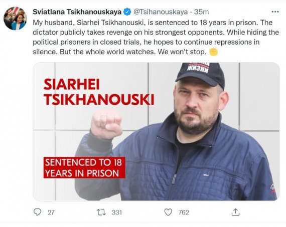 "Диктатор публічно мстить найсильнішим противникам. Ховаючи політв'язнів у закритих судових процесах, він сподівається продовжити репресії в тиші, але весь світ спостерігає за цим. Ми не зупинимося", - відреагувала на незаконний вирок Тихановська.