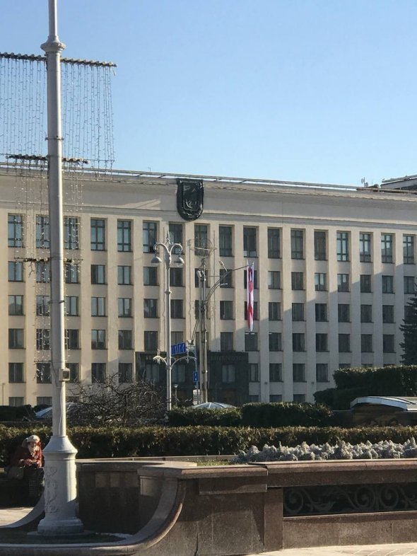 На багатьох будинках з'явилися величезні біло-червоно-білі прапори. Про це повідомляє NEXTA в Telegram.