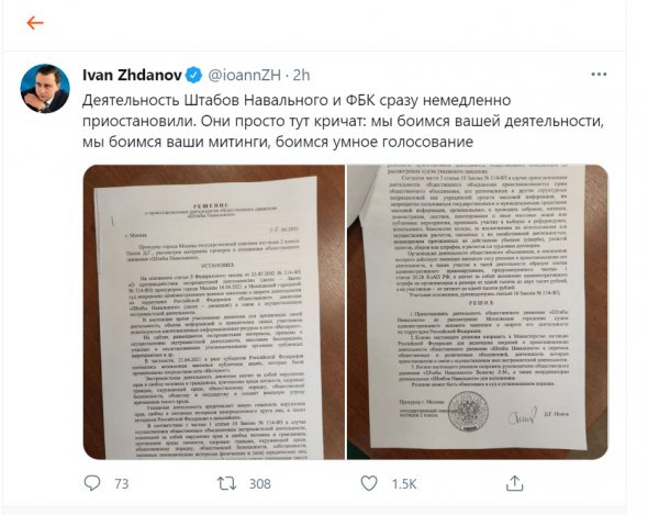 Він опублікував скани судового рішення, в якій прокурор Москви заявляє, що структури Навального розміщують на своїх сайтах "екстремістські матеріали, заклики до здійснення екстремістської діяльності, масових заворушень, участі в неузгоджених уповноваженими органами публічних заходах, та ін."