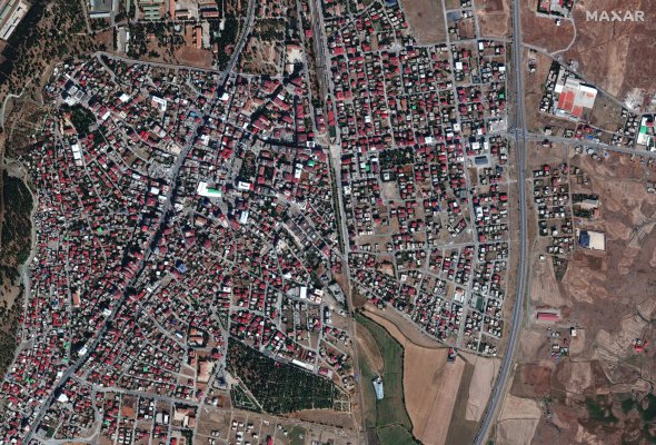 На знімках Maxar зображено турецьке місто Іслахіє до землетрусу - 4 жовтня 2022 р. і після - 7 лютого 2023 року. Зокрема, помітні зруйновані будівлі та рятувальні роботи.