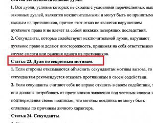 Також прописано етикет. На дуель можна викликати, якщо образили самолюбство, гідність та честь. При тому ображений має сказати: "Милостивый Государь, я пришлю Вам своих секундантов". Ображена жінка не бере участі в дуелях - за неї це робить чоловік. За недієздатних відповідальність несуть інші особи. Документ пропонує відновити дореволюційні "суди честі" - неформальний орган, який розбирає питання морального характеру. Їх функції буде виконувати безпосередній керівник учасників дуелі. Дворян у тексты замінили державними і муніципальними службовцями, різночинців - громадянами, корпорації - юрособами