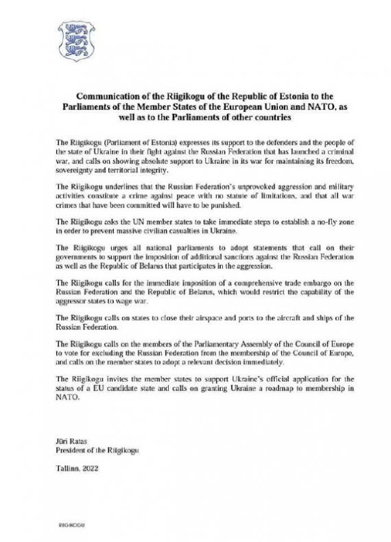 Парламент Естонської Республіки (Riigikogu) прийняв рішення із закликом до країн-членів ООН про закриття неба України від російського агресора.