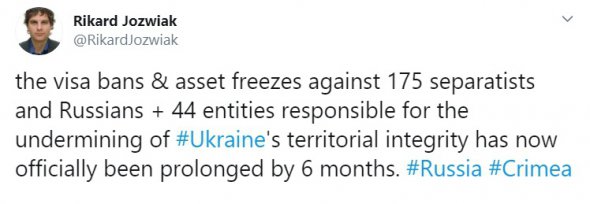 "Заборона в'їзду та замороження активів проти 175 сепаратистів та росіян, а також 44 суб'єктів, відповідальних за підривання територіальної цілісності України, тепер офіційно продовжено на 6 місяців", - написав Йозвяк.