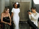 Зірка позувала в ніжно-рожевій, зефірній сукні. В руках тримала балони з фарбою. Крім цього Джолі приміряла сукню-комбінацію золотистого кольору. Образ доповнила оксамитовою накидкою.
