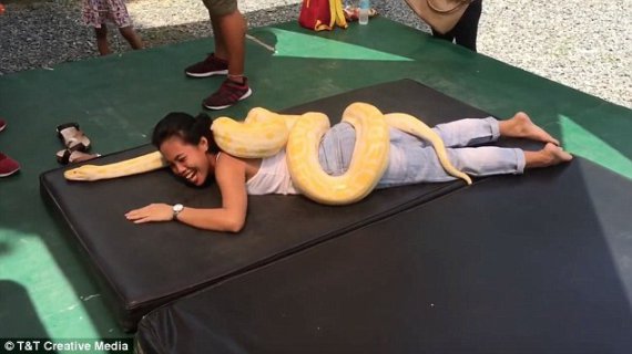 На опублікованому у мережі відео бірманський пітон-альбінос повзає по тілу жінки, виконуючи прохолодний освіжаючий масаж. Один сеанс коштує 100 пісо - близько $2, розповідає Daily Mail.