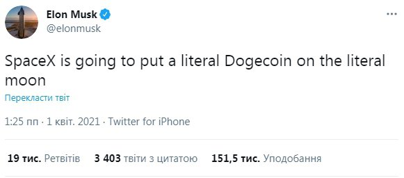 Після твіту Маска, який, ймовірно, є першоквітневим жартом, Dogecoin почав рости в ціні. Вартість криптовалюти зросла на майже 19% до позначки $0,063.