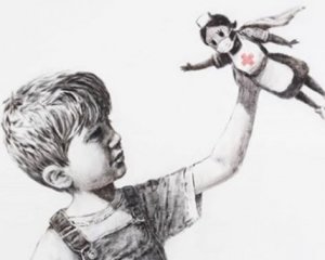 Так, на чорно-білій картині митця зображена дитина, яка сидить на підлозі і грає. У її лівій руці - фігурка медсестри, яка нагадує супергероя, що летить на допомогу.