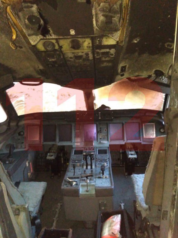 Також помітно, що всередині згоріла вся обшивка літака, а зі стелі звисають дроти. Сліди сажі також помітні і в кабіні пілотів.