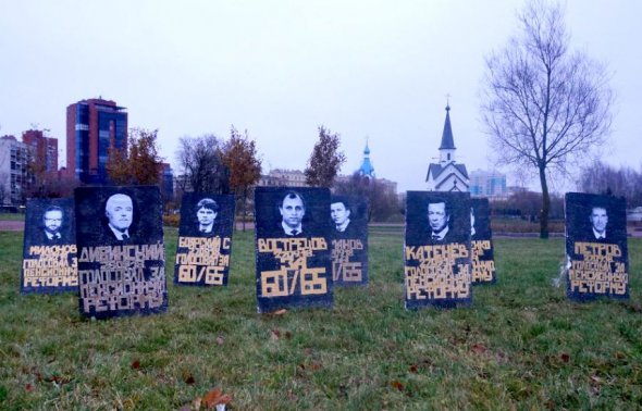 На могильних плитах були зображені Віталій Мілонов, Сергій Вострєцов, Володимир Катеньов, Євген Марченко та інші депутати з Петербургу.