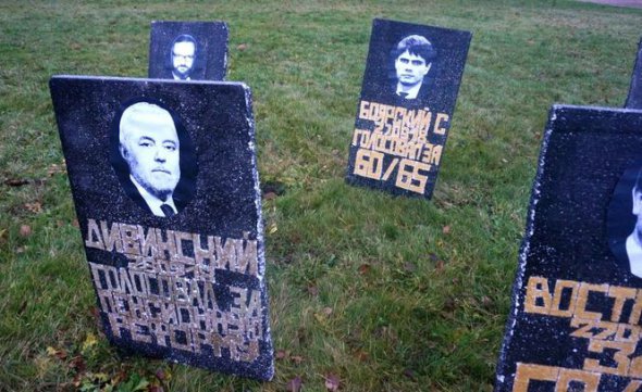 У російському Санкт-Петербурзі активісти лівих сил у Пулківському парку "поховали" 8 депутатів партії "Єдина Росія". Так активісти покарали "єдиноросів" за прийняття закону про підвищення пенсійного віку для росіян.