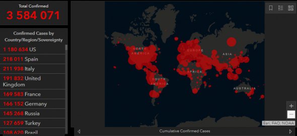 Усього в світі 3 584 071 інфікованих, повідомляє Центр системних досліджень та інжинірингу при Університеті Джонса Хопкінса (США).
