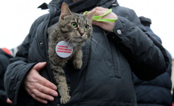 В Москві активісти тримають плакати з надписом "Бой!кот" та намальованим котом. В Петербурзі бойкотує живий кіт.