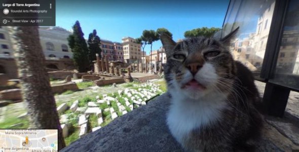 Нові фотографії вулиць Риму з'явилися в сервісі Google Street View. Кота з перекошеною мордою сфотографували творці сервісу на площі Торре-Арджентіна в італійській столиці.