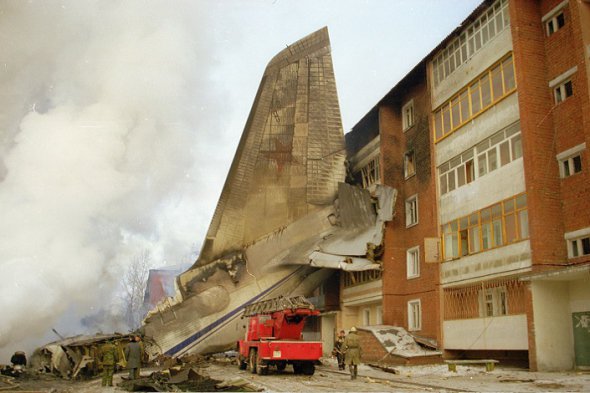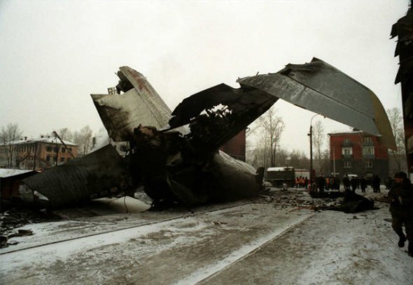 На одному працюючому двигуні екіпажу не вдалося утримати багатотонний літак в повітрі. "Руслан" звалився на будинок. Хвіст літака сперся на стіну 5-поверхового житлового будинку, крило зачепило за 2-поверховий житловий барак.