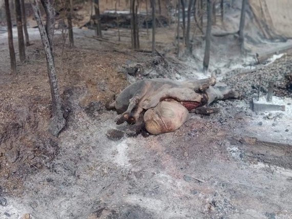 На світлинах видно зруйновані пожежею будинки й обвуглені рештки тварин.