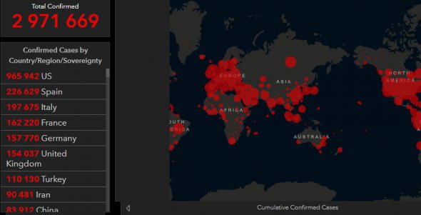 Усього у світі 2 977 669 інфікованих. Про це повідомляє Центр системних досліджень та інжинірингу при Університеті Джона Хопкінса (США).