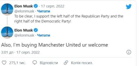 "Щоб було ясно, я підтримую ліву половину Республіканської партії і праву половину Демократичної партії. Крім того, я купую "Манчестер Юнайтед", ласкаво просимо", – ідеться в повідомленні.