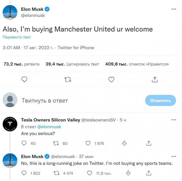 "Це давній жарт у Twitter. Я не купую спортивні команди", – зазначив засновник SpaceX.