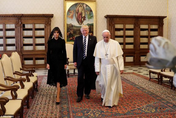 Меланія і Іванка одягли чорні сукні і мантільї - чорні накидки на голову. Такі одягають на знак поваги до понтифіка. Мантілью носила і Мішель Обама на зустрічі 2009-го.
