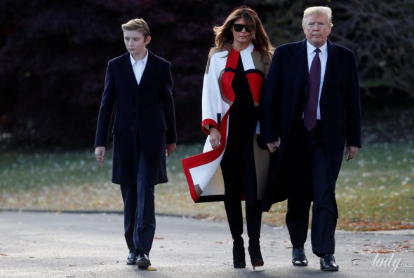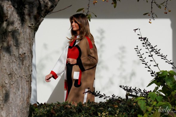 На дружині президента США було кашемірове пальто від Dior верблюжого кольору з яскравою чорно-біло-червоною аплікацією у супрематичному стилі.