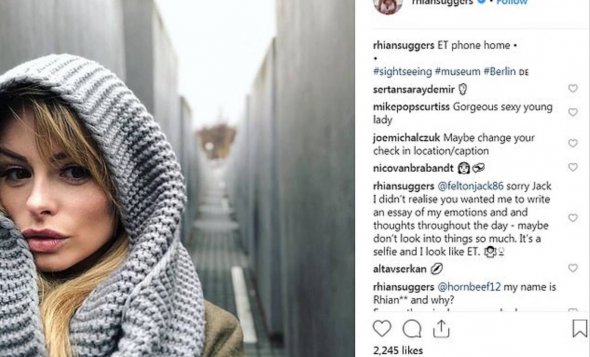 Британська модель Ріан Заґден нарвалася на критику в мережі після публікації в Instagram селфі на фоні меморіалу жертвам Голокосту в Берліні.