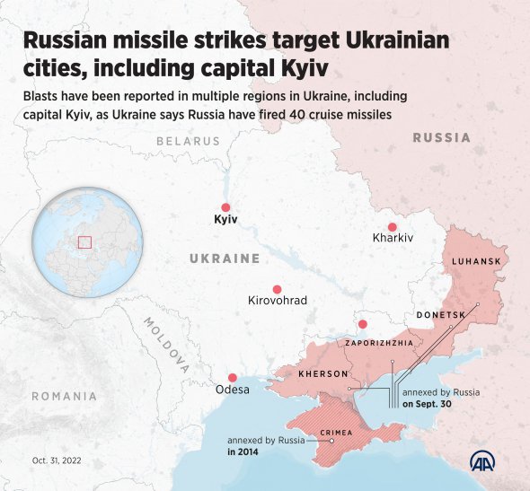 Київ заявляє, що удари по критично важливій інфраструктурі в глибині України, в районах, віддалених від лінії фронту, є частиною стратегії Кремля з деморалізації українців у міру наближення зими. В останні місяці українські сили повернули собі території, раніше захоплені Росією, але їхнє просування може сповільнитися через настання холодів.