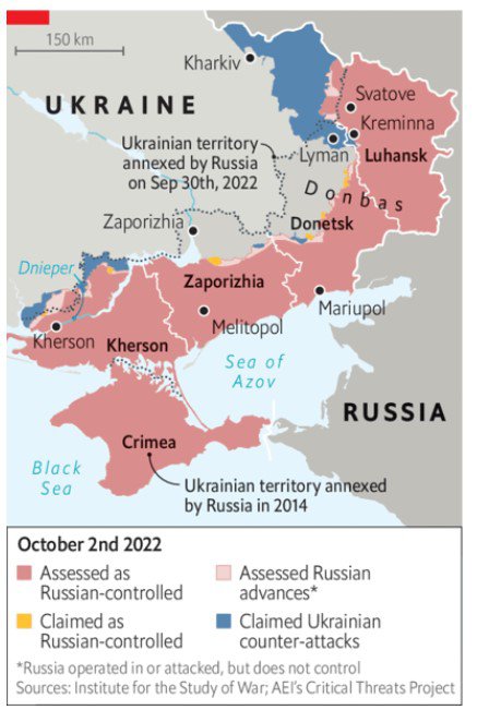 Росія окупує близько 15% території України, включаючи Крим. Але з вересня українці повернули собі великі ділянки землі на північному сході й півдні. Невідомо, чи змінить це рівняння масова російська мобілізація вдома.