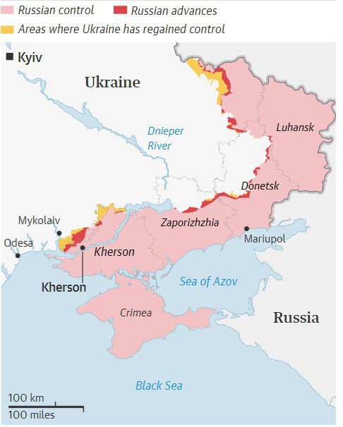Експерти західної розвідки вважають, що це питання часу, коли росіяни покинуть Херсон і відступлять за річку. Минулого тижня їхнє військове керівництво втекло на безпечніший лівий берег. Російські моторизовані й повітряно-десантні полки посилюють оборону, перекидаючи додаткових солдатів і техніку з Криму.