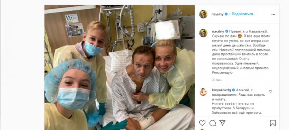 "Привіт, це Навальний. Сумую за вами. Я все ще майже нічого не вмію, але ось вчора зміг цілий день дихати сам. Взагалі сам. Ніякої сторонньої допомоги, навіть найпростіший вентиль в горлі не використав. Дуже сподобалось. Дивовижний, недооціненний багатьма процес. Рекомендую", - зазначив опозиціонер