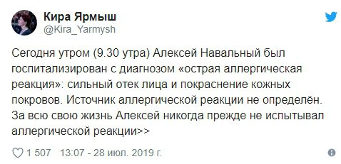 Прес-секретар ФБК Кіра Ярмиш пізніше Twitter підтвердила цей діагноз.