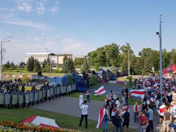"В бік Палацу Незалежності проїхала колонна важкої техніки, імовірно – БТР-80. Силовики, які перебувають біля Палацу Незалежності, підняли щити в бойову стійку. Тут помічені внутрішні війська, ОМОН, є військова техніка, в тому числі водомети, автозаки", - інформує Tut.by.
