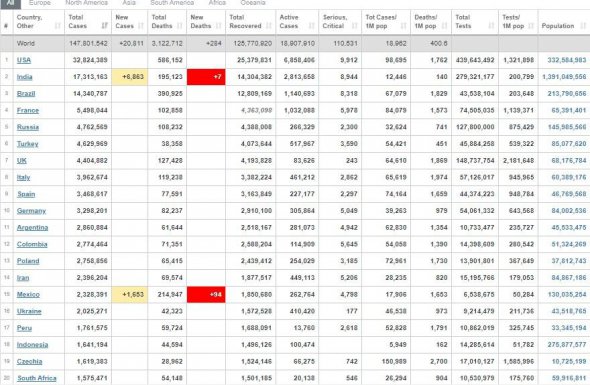 Україна посідає 16 місце у світі за кількістю нових інфікувань, пише сайт Worldometers. В Індії зафіксували понад 354 тис. нових хворих, у Туреччині – понад 38 тис. випадків інфікування, а в США – понад 34 тис. Крім того, понад 32 тис. випадків інфікування сталися в Бразилії, а понад 24 тис. – у Франції. Далі за кількістю хворих у рейтингу – Іран і Колумбія.