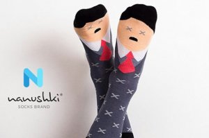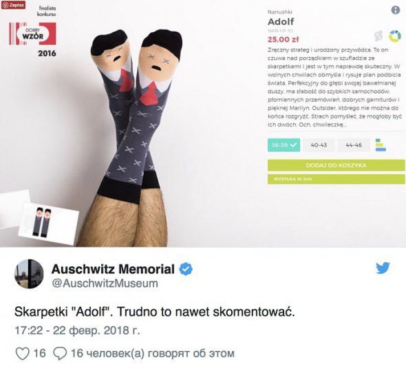 Польський бренд шкарпеток жартома випустив пару із зображенням чоловіка з чубчиком і вусами, як у Гітлера. Крім того, творці нарядили Адольфа в сорочку, краватку і светр, а також намалювали замість очей хрести, що нібито означає, що персонаж мертвий.