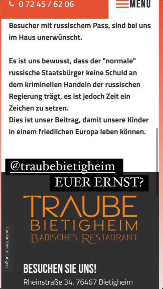 В одному із німецьких ресторанів відмовляються обслуговувати громадян Росії.
