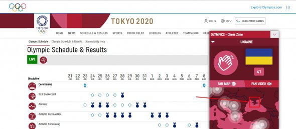 На сайті Олімпіади в розділі "Розклад і результати" розмістили карту з країнами, де вболівальникам пропонують підтримати свою збірну "оплесками". Україна та Крим там розділені.