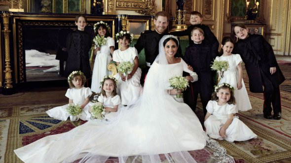 Гаррі та Меган на другому фото сфотографовані з подружками нареченої та пажами. На третьому - з королівською сім'єю та матір'ю Доріа Редлан.