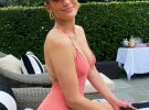 Співачка одягла ніжно-рожевий суцільний купальник із глибоким декольте та вирізами на ньому.