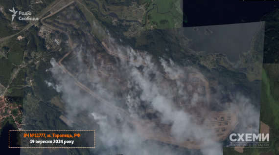 Це - результат атаки українських безпілотників на склад Головного ракетно-артилерійського управління Міністерства оборони РФ. Він розташований на території військової частини №11777 у місті Торопець Тверської області, повідомляє "Радіо Свобода".