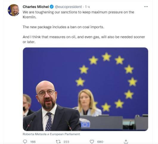 "Ми посилюємо наші санкції, щоб зберегти максимальний тиск на Кремль. Новий пакет обмежень включає заборону імпорту вугілля. Але я думаю, що заходи щодо нафти і навіть газу теж рано чи пізно знадобляться", - зазначив він.
