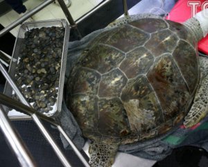 Тайські ветеринари прооперували черепаху, яка з'їла майже тисячу монет. Під час складної операції з черева 25-річної морської черепахи витягли 915 монет. Тварина з'їла залізні гроші, які люди кидали у воду на удачу.