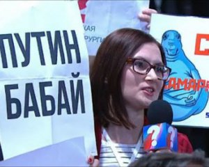 Журналістка з Татарстану тримала табличку "Путін бабай". За її словами, татарською це означає "дідусь Путін".