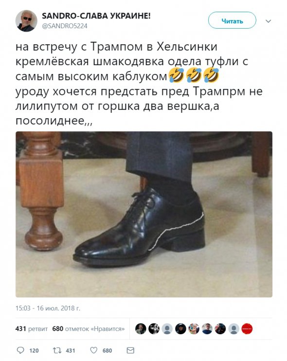 "На зустріч з Трампом в Гельсінкі кремлівська шмакодявка одягла туфлі з найвищим каблуком. Виродку хочеться постати перед Трампом не карликом від горшка два вершка, а соліднішим", - йдеться у підписі до фото.